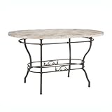 A great gathering place where meals are had and conversation is welcome. A race track shaped oval top with bordered diamond pattern natural stone mosaic top on a multi stretchered antique pewter finished tubular steel base. Some assembly required.
